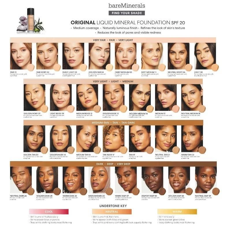 Bare Minerals Original Liquid Mineral Foundation SPF 20 findes i et hav af farver og nuancer, så det er bare med at finde den foundation, der passer til dig.
