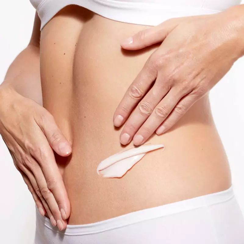 - Påføres på maven med lange, cirkulære bevægelser med uret 7 gange for at tone maven