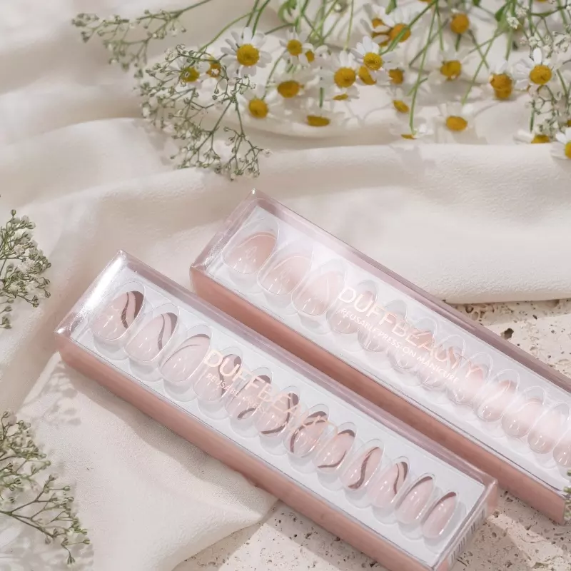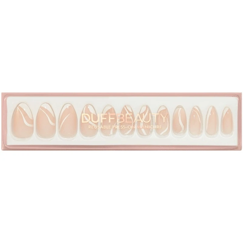 DUFFBEAUTY Reusable Press-On Manicure Nails – Milky Swirl er en pakke med 24 negle i 12 forskellige størrelser, så der er rig mulighed for at finde den perfekte størrelse, som passer til lige netop dine negle.