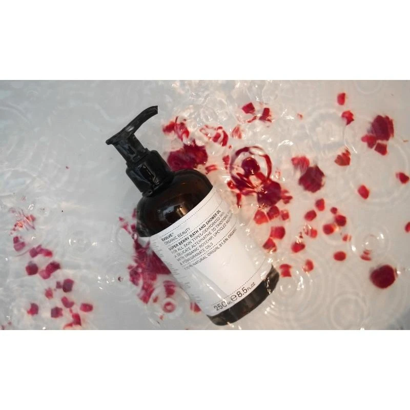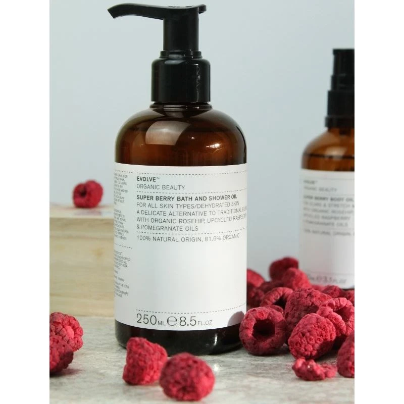Evolve Super Berry Bath & Shower Oil er en utrolig lækker badeolie, som egner sig specielt godt til tør hud, men kan også bruges til alle andre hudtyper. Den lette olie renser og fugter huden på samme tid, hvilket gør at den fungerer som et alternativ til den traditionelle showergel.