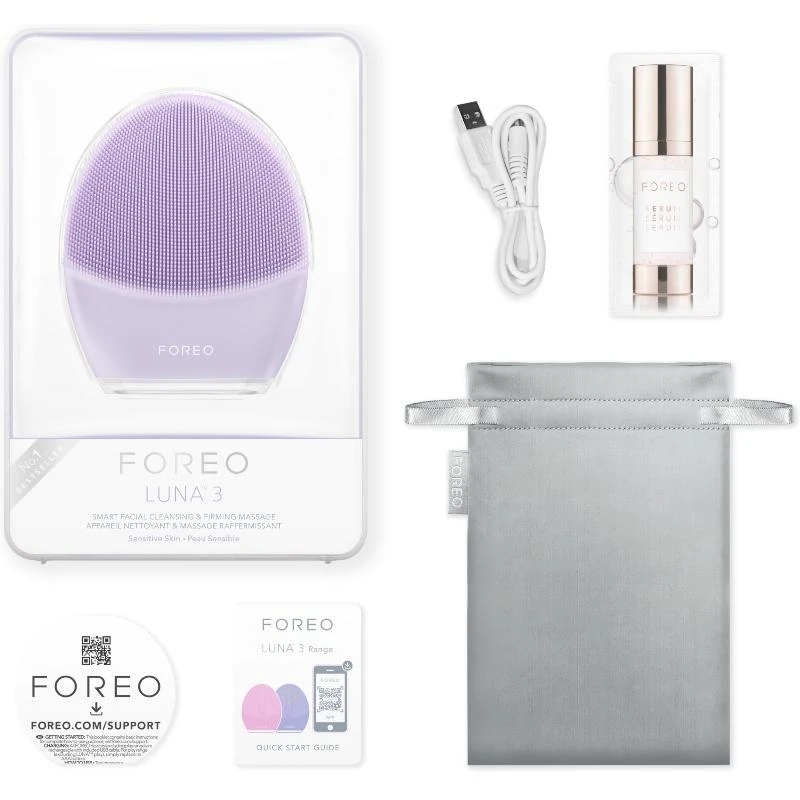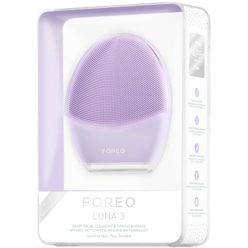 Foreo Luna 3 For Sensitive Skin – Purple er en revolutionerende silikone børste, der er velegnet til sensitiv hud. Denne børste renser din hud i dybden på en utrolig behagelig, og effektiv måde. Den er udviklet i et smidigt materiale der ligger behageligt i hånden, og sørger for at du kan komme ind og rense selv de mest besværlige steder. Børsten udsender små vibrationer, der kan reguleres i forskellige niveauer, så du skånsomt kan rense huden præcis efter dit behov.