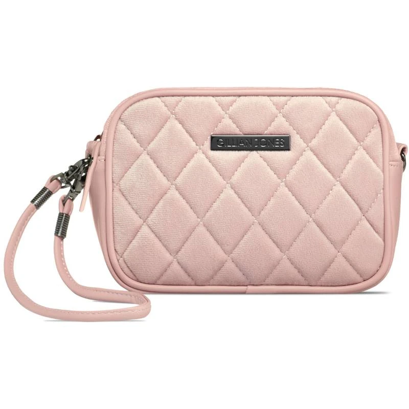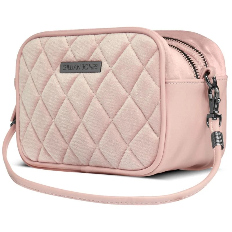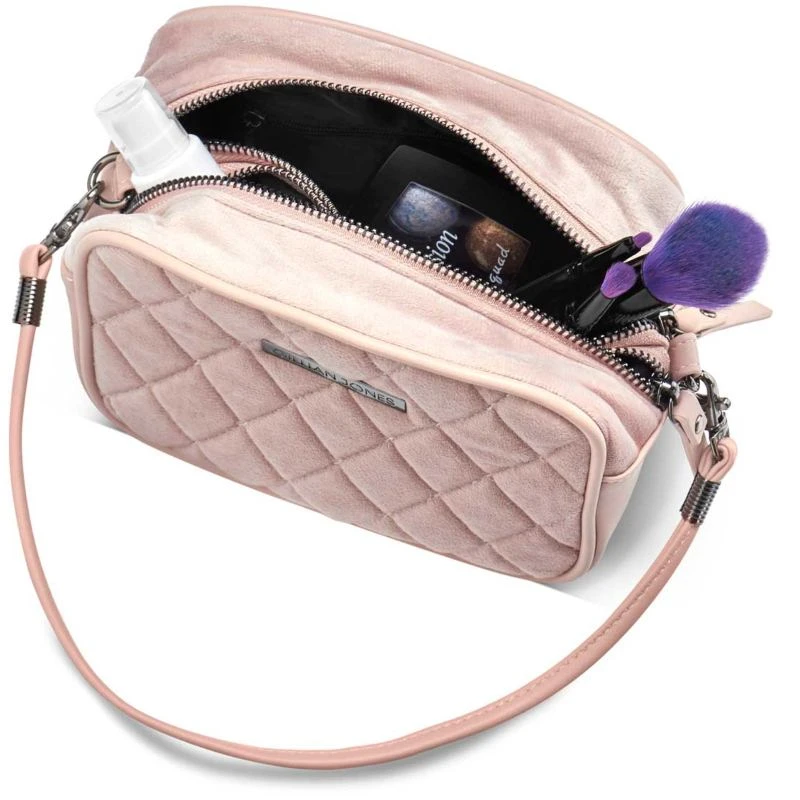 Gillian Jones Rosa Quiltet Velour er en utrolig smuk toilettaske, som samtidig er praktisk. Den har to store rum, som lukkes med lynlås, og indeni det ene rum er der ydermere et mindre rum, som også er med lynlås, hvori man kan opbevarer sine mindste genstande. Tasken er skabt i et lyserødt kunstlæder og velour, som giver et feminint look, og der medfølger en aftagelig hank.