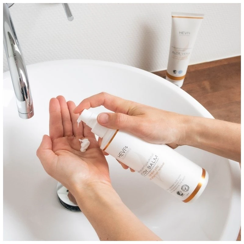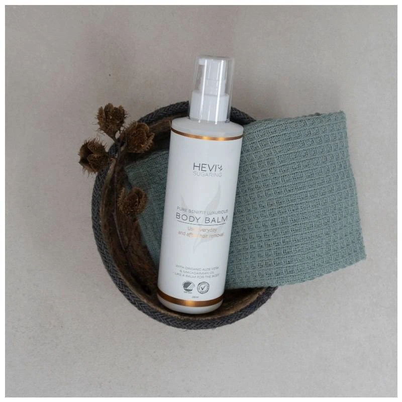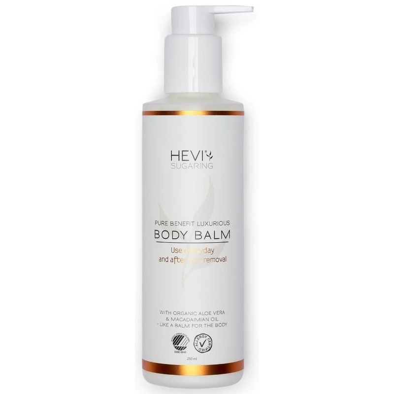 Hevi Sugaring Body Balm er en blødgørende og helende creme til kroppen. Den er beriget med macadamiaolie, som har en blødgørende virkning, virker styrkende, opretholder hudens fedtstof. Derudover indeholder den antibakteriel aloe vera og panthenol, som fugtgiver huden i dybden samt virker både genopbyggende og beroligende. Den er ideel af anvende efter hårfjerning, da den modvirker risikoen for indgroede hår, røde knopper og skægpest. Den er med sine naturlige ingredienser anvendelig for alle hudtyper og dermed en bodylotion, som kan anvendes af hele familien.