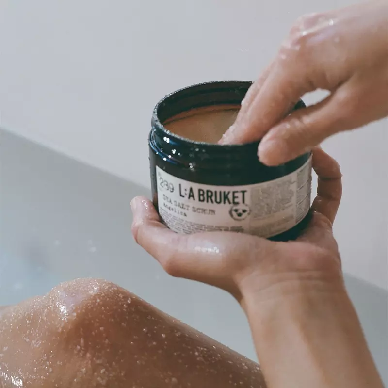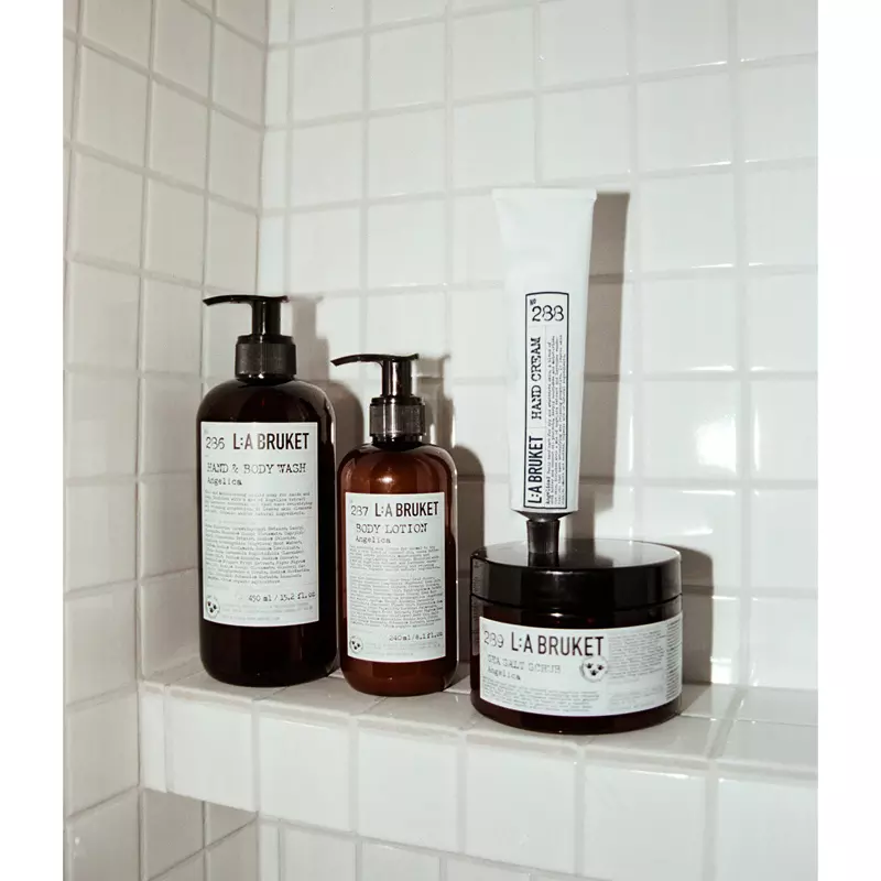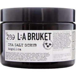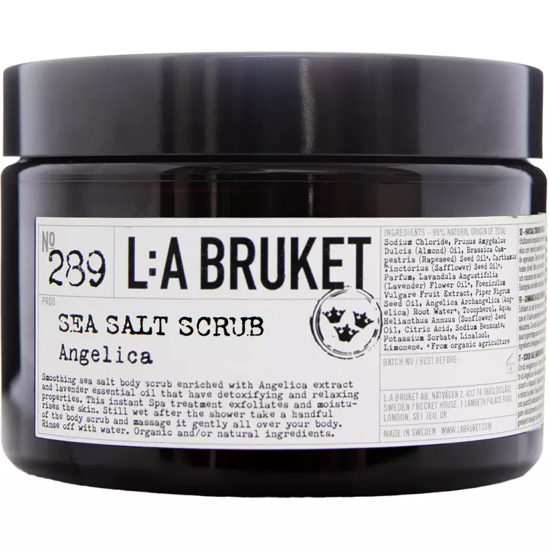 L:A Bruket 289 Sea Salt Scrub – Angelica er en skøn bodyscrub, som eksfolierer, nærer og fornyer huden. Den er beriget med naturligt havsalt, angelikaekstrakt og æterisk lavendelolie, som giver huden en skånsom og dybdegående peeling. Dermed fjernes døde hudceller og blodcirkulationen stimuleres, samtidig med at hudens tilføres fugt og næring, så den efterlades silkeblød, glat og med en mere klar og levende hudtone.