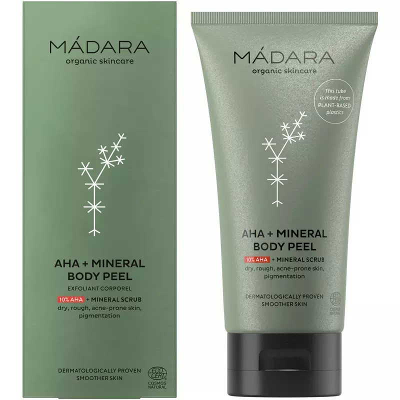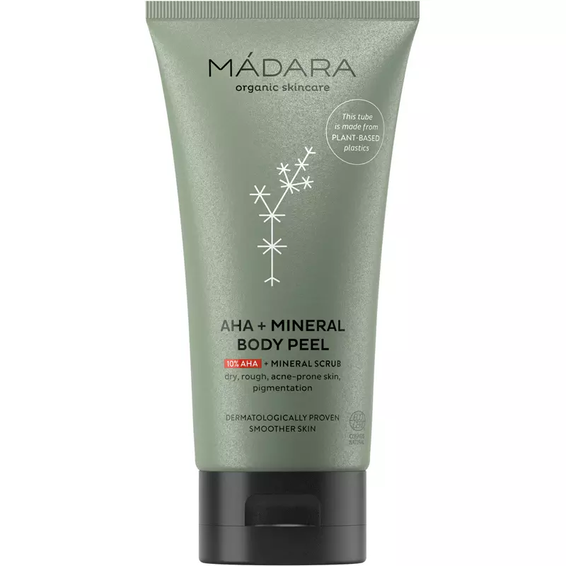 MÁDARA AHA + MINERAL Body Peel er en lækker og effektiv peeling til kroppen. Den kan bruges til alle hudtyper, men er særlig velegnet til tør og ru hud, samt hvis du har tendens til uren hud eller hyperpigmenteringer.