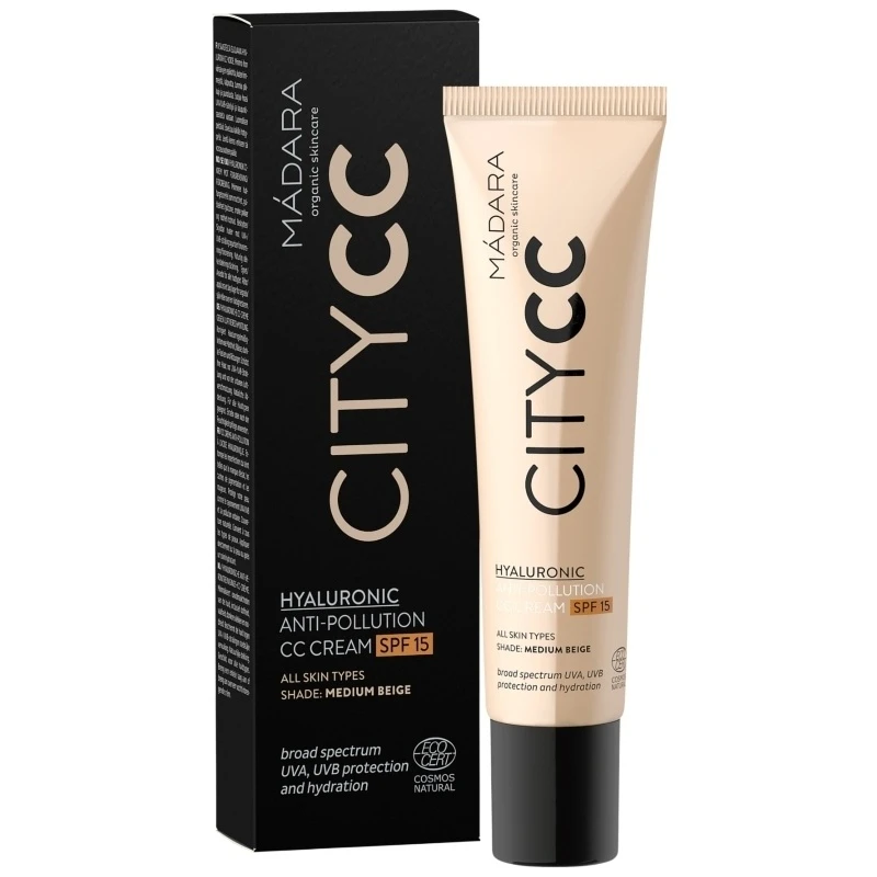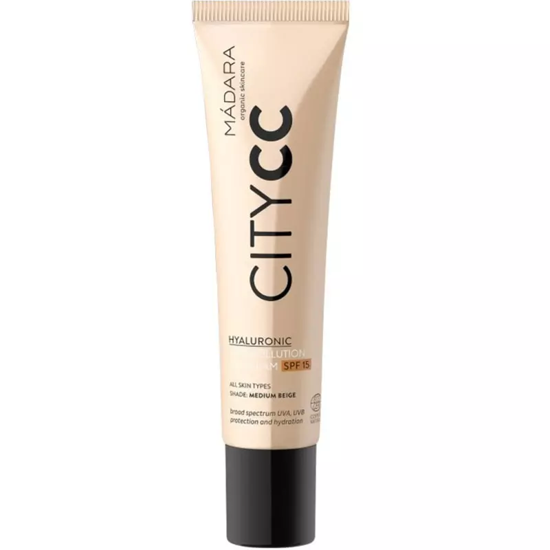MÁDARA CITY CC Hyaluronic Anti-pollution CC Cream SPF 15 – Medium er den perfekte løsning til en travl hverdag, hvor du ønsker en smuk og sund hud på kort tid. Denne CC cream kombinerer hudpleje og makeup i én enkelt formel, der giver dig en fejlfri, naturlig og ensartet teint.