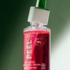 MÁDARA PEEL Hyaluron Intense Peel Serum er beriget med 10% mælkesyre (AHA) og hyaluronsyre, som både eksfolierer, fugter og giver huden fornyet fylde. Virkninger, der er med til at fremme en glattere, mere ensartet hud med en levende glød.