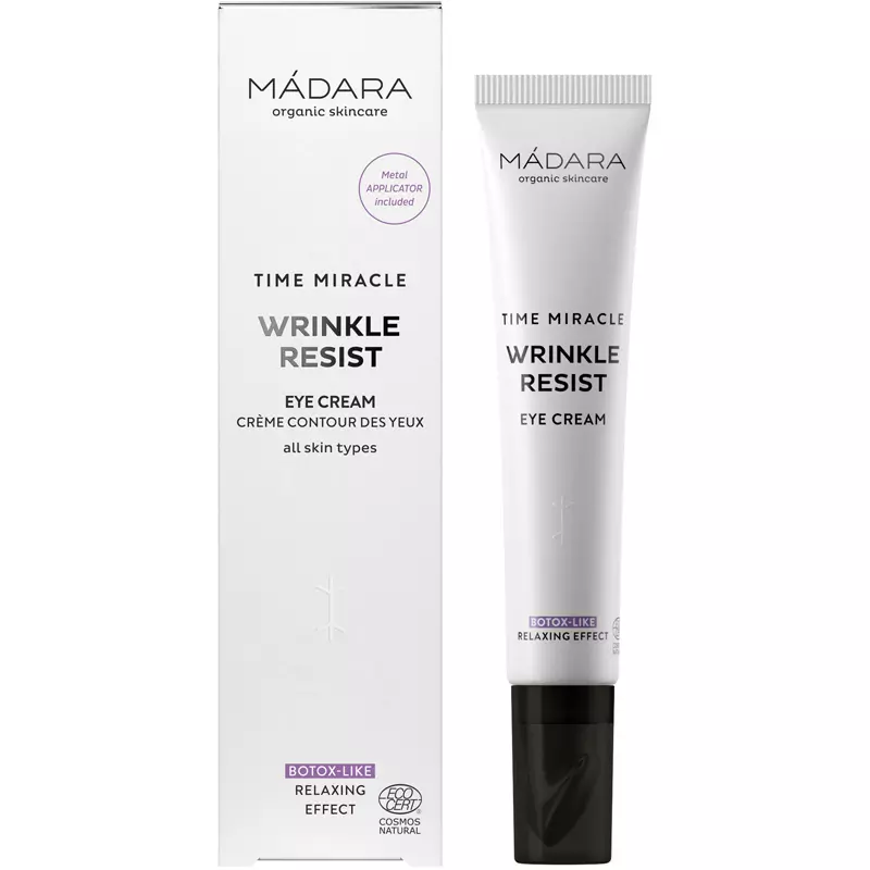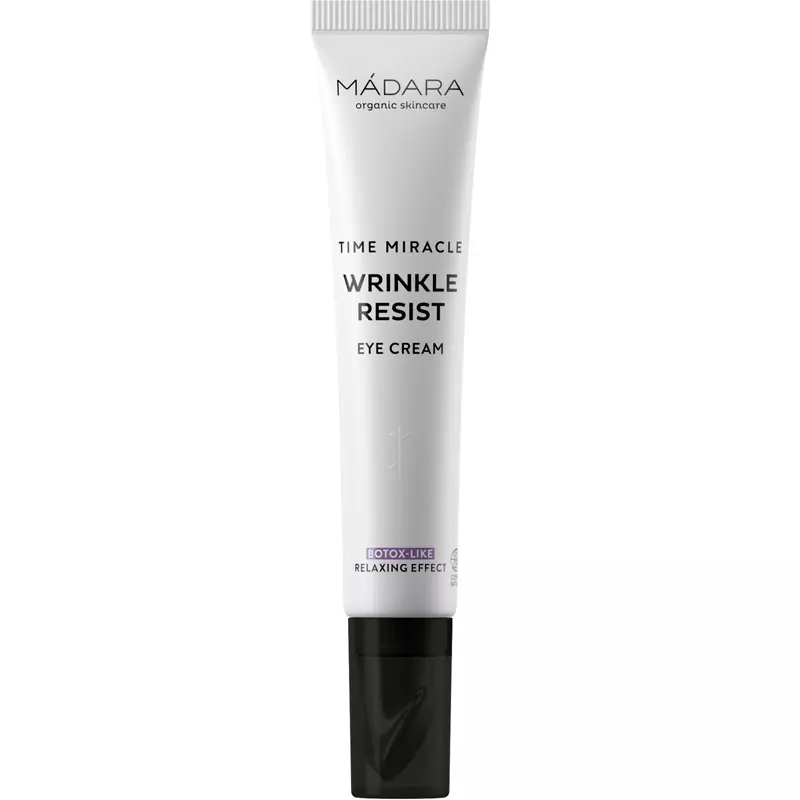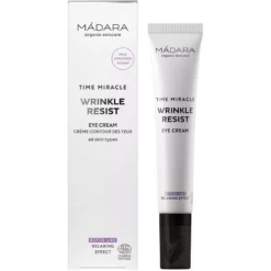 MÁDARA Time Miracle Wrinkle Resist Eye Cream er en yderst effektiv øjencreme, som bekæmper rynker, fine linjer og træthedstegn omkring øjnene. Den er udviklet med naturlige, aktive ingredienser, som reducerer synlige ældningstegn, samt genopliver og forbedrer huden i de sarte øjenomgivelser.