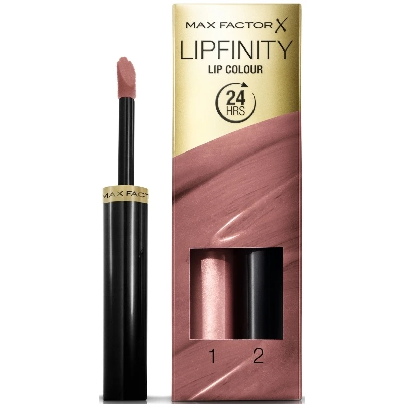 Max Factor Lipfinity Lip Colour 24 Hrs Essential Brown er et genialt 2 trins system, der giver dig smukke og forførende læber, der holder i op til 24 timer. Sættet indeholder en lipgloss samt en fugtgivende top-coat. Du kan vælge imellem et væld af smukke farver, så hvad enten du er til et naturligt look eller ønsker mere fokus på dine læber, er der en farve der passer til netop dig.