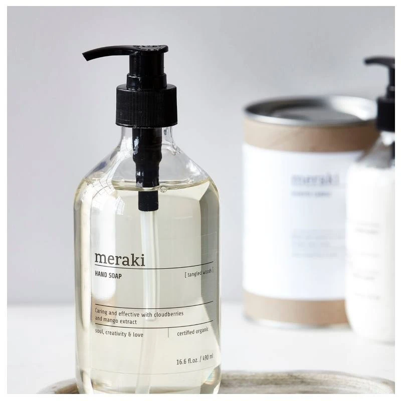 Meraki Hand Soap Tangled Woods er en skøn og effektiv, men stadig mild håndsæbe. Håndsæben rengør skånsomt hænderne og har særdeles sansevækkende aroma, hvilket giver velduftende og rene hænder hver gang.. Den er velegenet til alle hudtyper, selv sensitiv hud. Den fine håndsæbe er økologisk certificeret og indeholder økologisk aloe vera der plejer og fugter huden. Stil håndsæben på en lille bakke og lad den være et dekorativt element i badeværelset eller køkkenet. Den er velegnet til daglig brug og til alle hudtyper og efterlader hænderne velduftende.