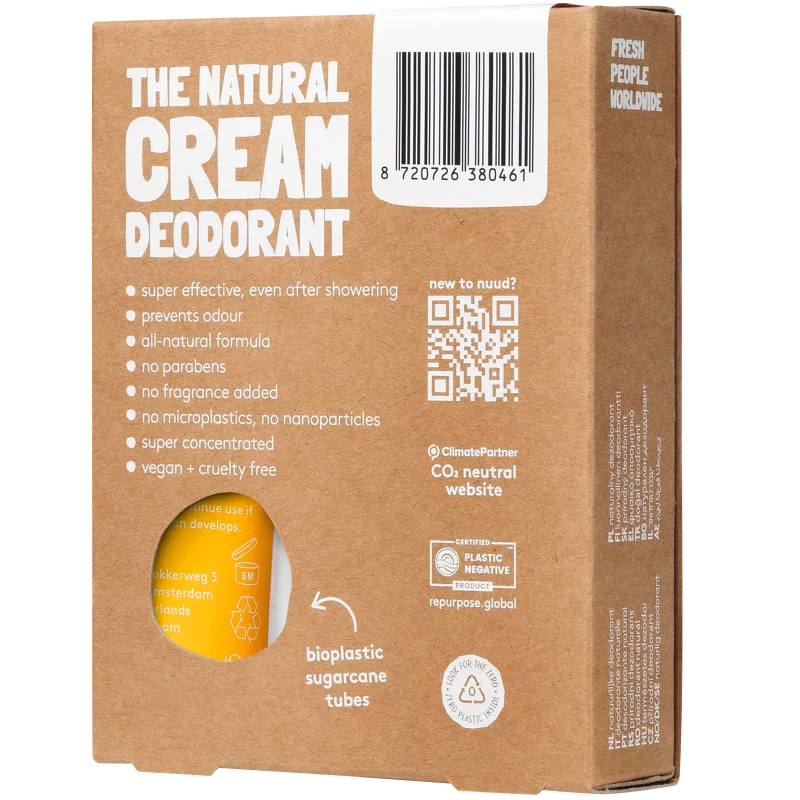 Nuud Family er en familiepakke, der indeholder 4 helt særlige og unikke creme deodoranter, der bekæmper svedlugt, men på en måde så den både beskytter dig, dine omgivelser og miljøet. Elsker du også at være typen der kan komme dine problemstillinger til livs, på den mest grønne måde og med samvittigheden i behold, så har Nuud nu givet dig den perfekte mulighed. Deres creme deodorant er nemlig uden aluminium, parabener, kemikalier, salt, parfume og alkohol. Istedet er den sprængfyldt med plejende, dybdegående og nærende ingredienser såsom mikrosølv, kokosolie, castor olie, zink oxid og mandelolie, der kombineret med hinanden er den bedste sammensætning for at komme dårlig odour til livs. Så kommer vi til indpakningen. For ikke nok med at indholdet er miljøvenligt, så er selve tuben og indpakningen også med omtanke for vores jord. Tuben er nemlig udviklet i sukkerrør og æsken er i bionedbrydeligt pap.