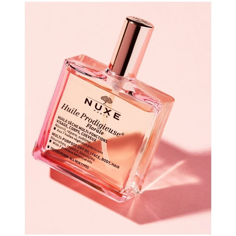 Nuxe Huile Prodigieuse Florale Multi-Purpose Dry Oil er en nyfortolkning af den meget populære tørolie, og denne gang er den med en ny duft: den er nemlig med skønne duftnoter af magnolia, moskus og grapefrugt. Dette er en olie, som kan anvendes på kroppen, ansigtet og i håret. Den indeholder 7 botaniske planteolier, nogle af dem er hasselnød, mandel og macademia. E-vitaminer indeholder den også, og alle disse nærende olier og vitaminer er med til at give en smidig og glat hud, udviske strækmærker, samt et silkeblødt hår. Kort sagt er det en multi funktionel tør-olie, som fugter, nærer og reparerer, og efterlader dit hår og din hud lækker og blød. Alle Nuxe produkterne er uden parabener og indeholder eksklusive blomster- og planteekstrakter.