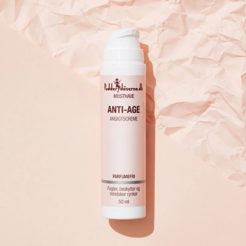 Pudderdåserne Anti-Age Ansigtscreme er en fugtgivende creme, som måske nærmere burde betegnes som et serum. Formlen er beriget med peptider, B3-vitamin og hyaluronsyre, så både arbejder på at give huden fugt og på at reducere fine linjer og rynker.