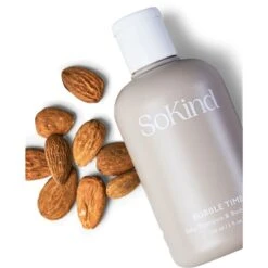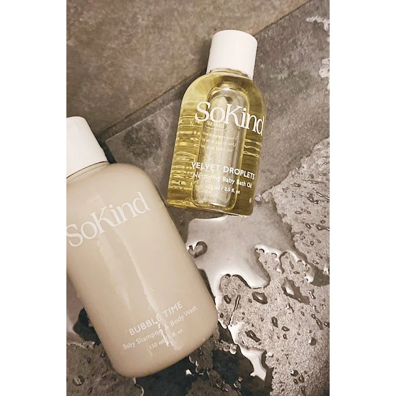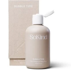 SoKind Bubble Time Baby Shampoo & Body Wash er udviklet med omtanke for både miljøet og den fine, sarte babyhud. Den er Allergy Certified og vegansk, samt fri for parfume, farvestoffer og alkohol. Den er fyldt i bæredygtig emballage af biologisk nedbrydeligt plastik, mens æsken er af miljøvenligt, FSC-certificeret pap, der også er 100% biologisk nedbrydeligt.