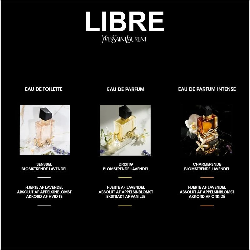 YSL Libre EDT er en super lækker og opfriskende parfume, man snildt kan bruge på daglig basis. Noget af det helt særlige ved YSL Libre EDT, er at skaberen har formået både at gøre den super let, samtidig med at den har massere af dybde. Det kræver noget helt specielt at sammensætte en duft der rummer begge dele, og man må sige at de har ramt fuldstændig plet. Denne luksuriøse parfume, kommer i smuk og elegant flakon, der pynter på ethvert badeværelse, og ligger super godt i hånden, til når de gyldne dråber skal støvregne ned over dig.